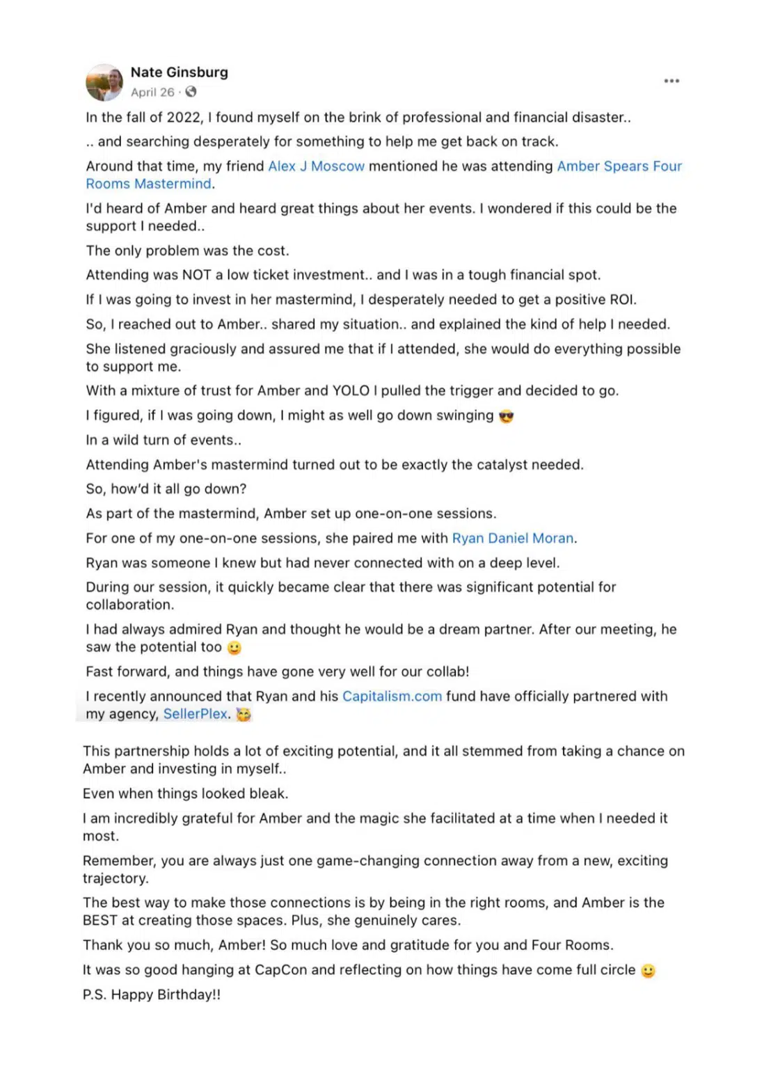 “I got in Four Rooms pretty early in the start of our business. But I can tell you that the Four Rooms membership has been as far as quantifying it in millions without a doubt. It’s been worth millions since we started this business, and I know that this information and revenue that I would not have if I didn’t join this group, and because this has been worth millions to your business through the matchmaking process, how has Amber and the team been able to give you who you need to meet at these. Oh my god, the matchmaking process has been amazing.”